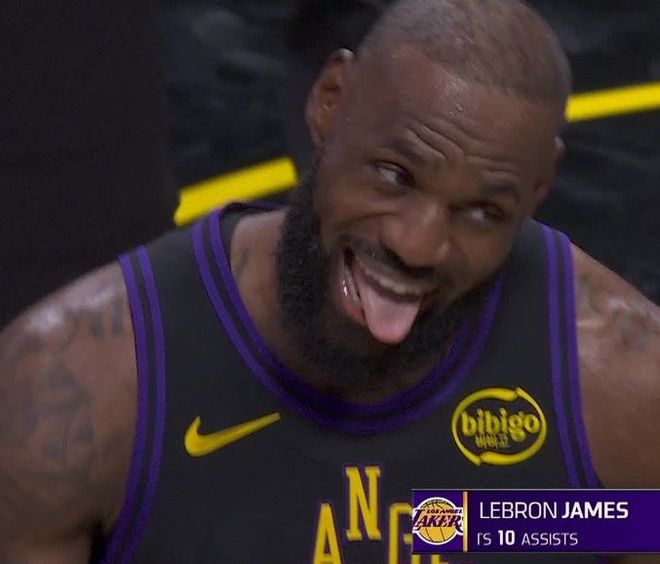 詹姆斯第三节再送2次助攻,并在末节登场的5分多钟送出6次助攻,激活湖人团队攻势逐步扩大20+领先优势。詹姆斯一度吐舌大笑极为开心,且出场不到30分钟被换下场,也是提前打卡下班。